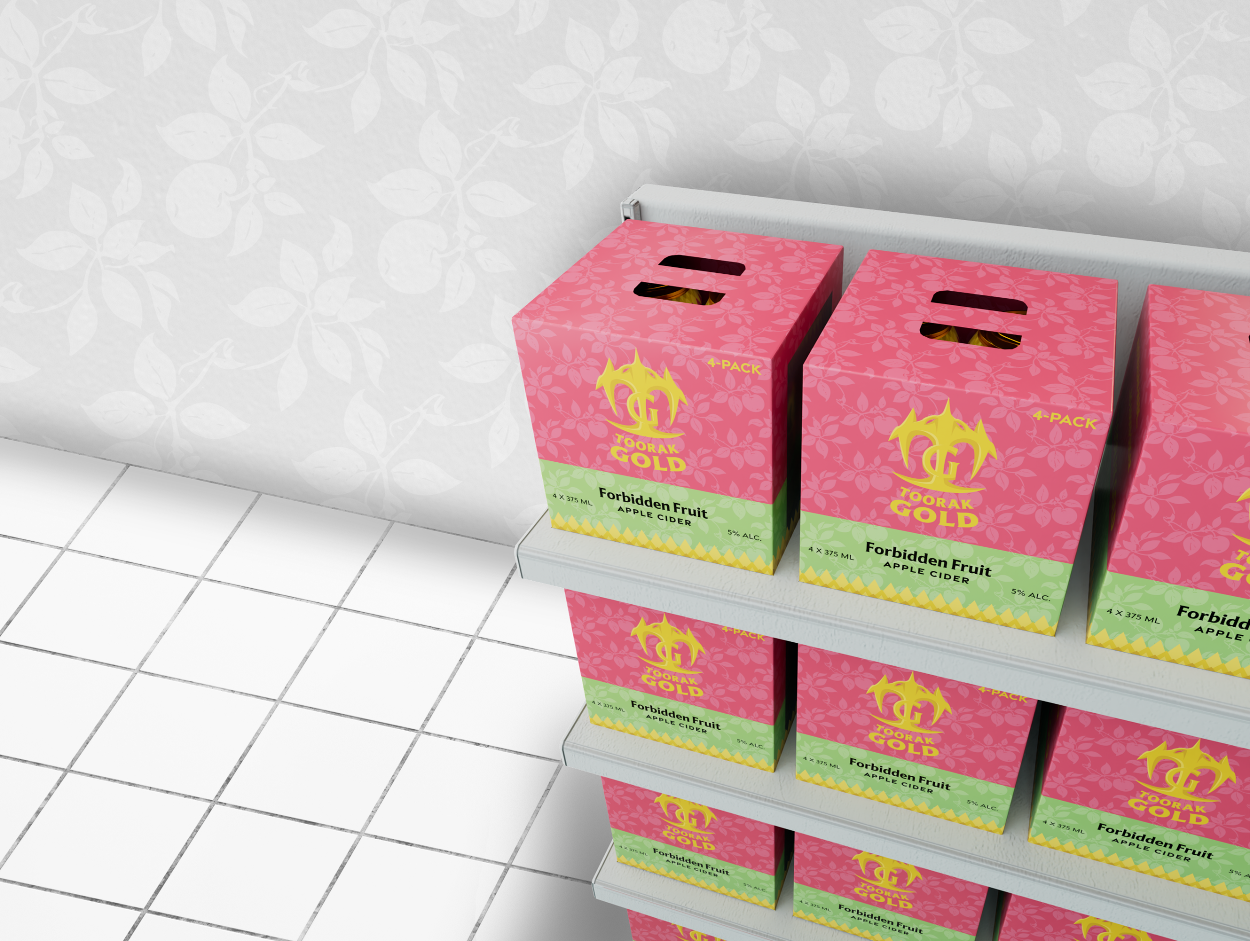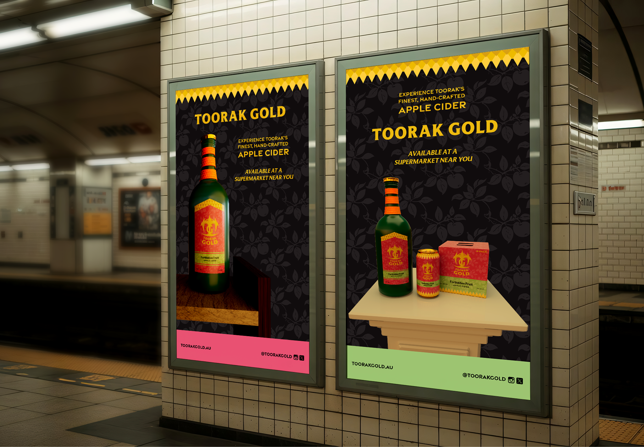 The name, Toorak Gold, utilizes the location of the cidery, as research dictates that it makes the beverage feel more authentic and trustworthy. The word, Gold, of course adds a sense of power and avarice.